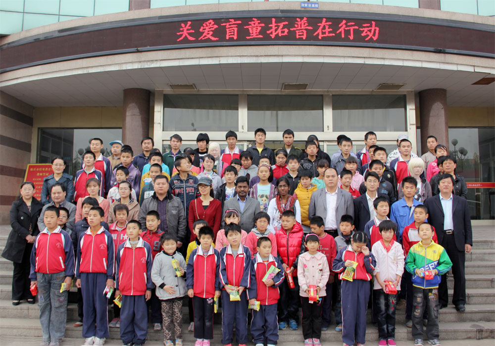 2012年10月24日,臨沂市拓普網(wǎng)絡(luò)有限公司愛(ài)心代表團(tuán)隊(duì)十余人到臨沂特殊教育中心,為盲童送去生活用品、食品以及他們急需的掛歷紙。其中,拓普公司印度籍員工BABU和KAMALAM作為國(guó)際友人,也去為孩子們獻(xiàn)上自己的一份愛(ài)心。