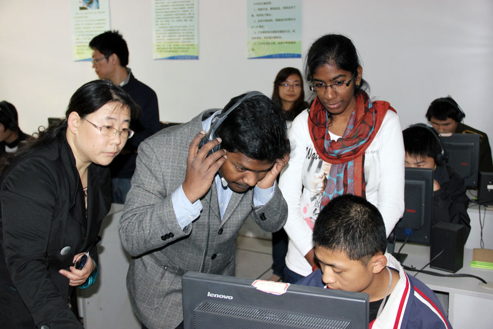 關(guān)愛(ài)盲童活動(dòng)現(xiàn)場(chǎng) 印度籍軟件專家BABU(左二)與KAMALAM(左三)與同學(xué)們互動(dòng)交流 臨沂市拓普網(wǎng)絡(luò)有限公司為孩子們捐贈(zèng)的部分物資