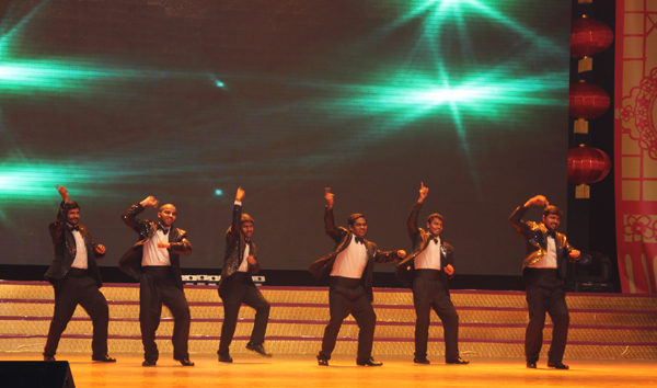 晚會在《金蛇舞新春》中拉開帷幕,近百名演員用歡快的舞蹈,舞出了豐收的喜悅和新春的希望。當晚晚會節(jié)目豐富多彩,既有滿文軍、鄭緒嵐、常思思等知名藝術家的精彩演出,也有各部門各單位推薦的優(yōu)秀節(jié)目。其中,由開發(fā)區(qū)達人們演唱的《拜新年》,為大家獻上最美好的祝福;由開發(fā)區(qū)宣傳部創(chuàng)作的配樂詩朗誦《我捧起腳下這片熱土》謳歌了開發(fā)區(qū)人甘于奉獻,揮灑汗水建設美好家園的壯志豪情;由開發(fā)區(qū)拓普網(wǎng)絡的印度專家、護士、警察、學生等群眾聯(lián)合主演的情景劇《滿天星》,將人們引入美好的遐想,由公司印度專家改編的“騎馬舞”閃耀全場,將氣氛不斷推向高潮。由于被熱情的舞臺所吸引,印度專家RATHA在其他演員都下場后還盡情的狂跳,幽默搞笑的氛圍感染了現(xiàn)場的每一位觀眾。