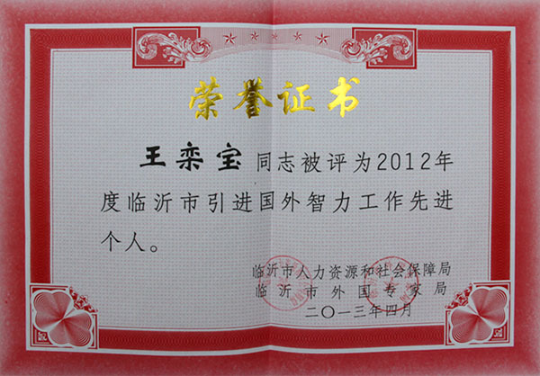 2013年4月13日,王總獲得由臨沂市人力資源和社會(huì)保障局和市外國(guó)專家局頒發(fā)的“2012年度臨沂市引進(jìn)國(guó)外智力工作先進(jìn)個(gè)人”榮譽(yù)證書(shū)。