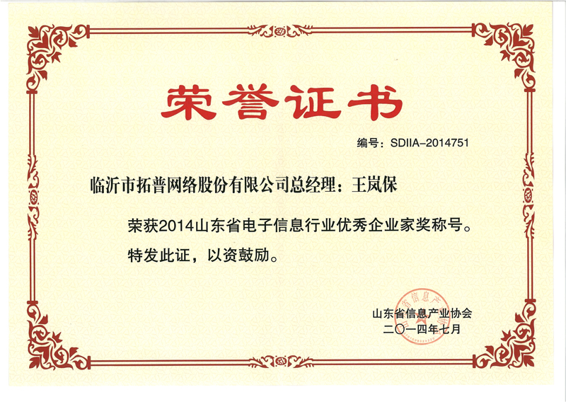 | 熱烈祝賀公司總經(jīng)理王嵐保榮獲2014年山東省電子信息行業(yè)優(yōu)秀企業(yè)家 |