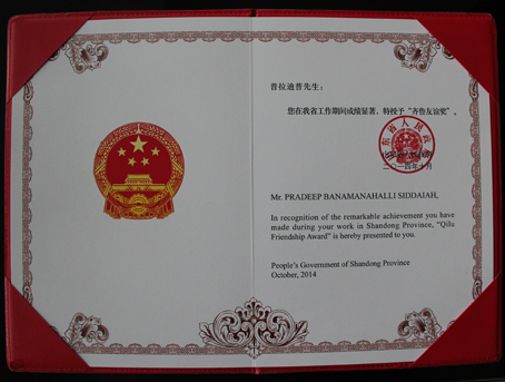 | 熱烈祝賀公司印度專家普拉迪普榮獲2014年“齊魯友誼獎(jiǎng)” |