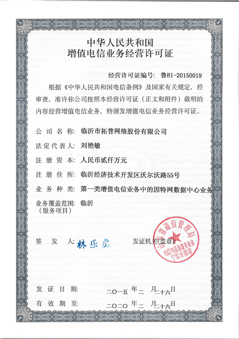 2015年2月26日,公司獲得由山東省通信管理局頒發(fā)的《中華人民共和國增值電信業(yè)務(wù)經(jīng)營許可證》,意味著公司獲得IDC數(shù)據(jù)中心經(jīng)營許可。這一證書的頒發(fā),保證了公司網(wǎng)上應(yīng)用服務(wù)合法經(jīng)營的權(quán)利,使公司相關(guān)信息化業(yè)務(wù)更具備合法性,可信度更高,還可享受稅收優(yōu)惠政策,為公司電信業(yè)務(wù)的開展提供了有力的條件。